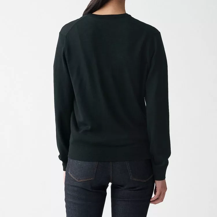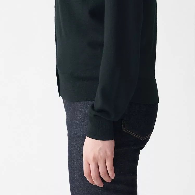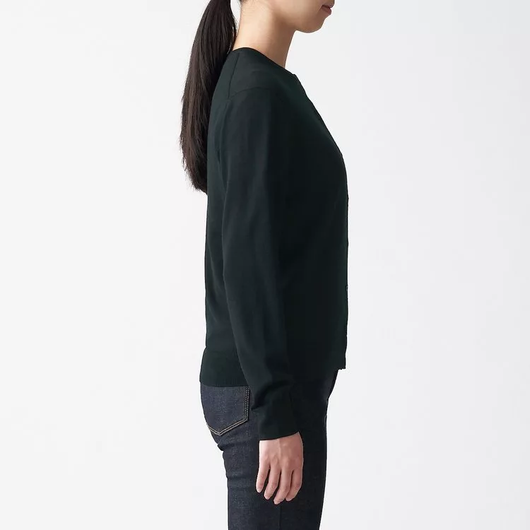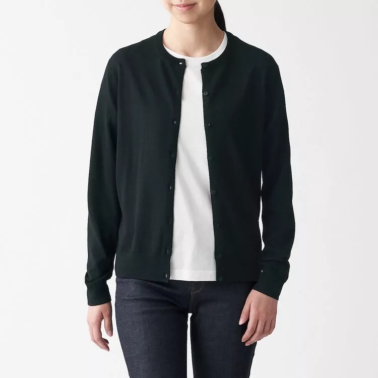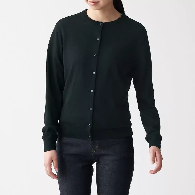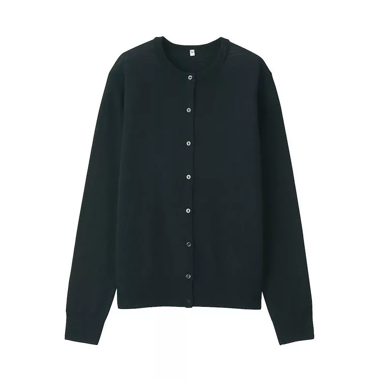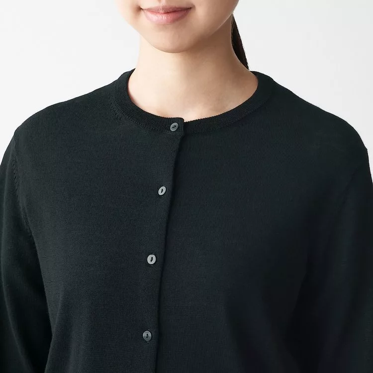 [MUJI無印良品]女羊毛混蠶絲可水洗圓領開襟衫M黑色