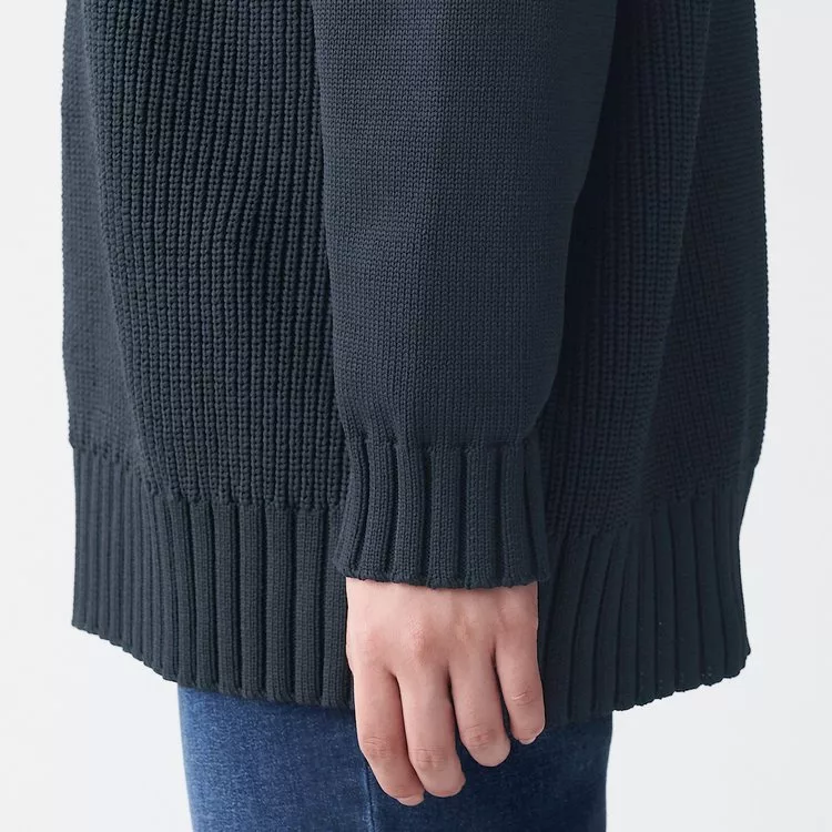 [MUJI無印良品]女聚酯纖維中空紗螺紋半高領長版衫黑色M-L