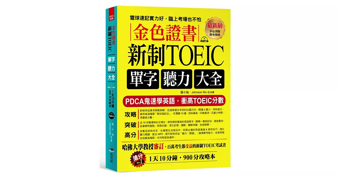 商品描述: 書名:金色證書:新制TOEIC單字聽力大全 –PDCA鬼速學英語,衝高TOEIC分數(附MP3),語言:繁體中文,ISBN:9789869587259,頁數:416,出版社:布可屋,作者:張小怡,Johnson Mo,出版日期:2018/01/31,類別:語言學習