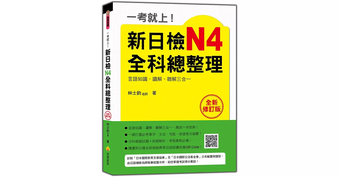 商品描述: 書名:一考就上!新日檢N4全科總整理全新修訂版(隨書附贈日籍名師親錄標準日語發音+朗讀MP3),語言:繁體中文,ISBN:9789869575041,頁數:288,出版社:瑞蘭國際,作者:林士鈞,出版日期:2018/01/25,類別:語言學習