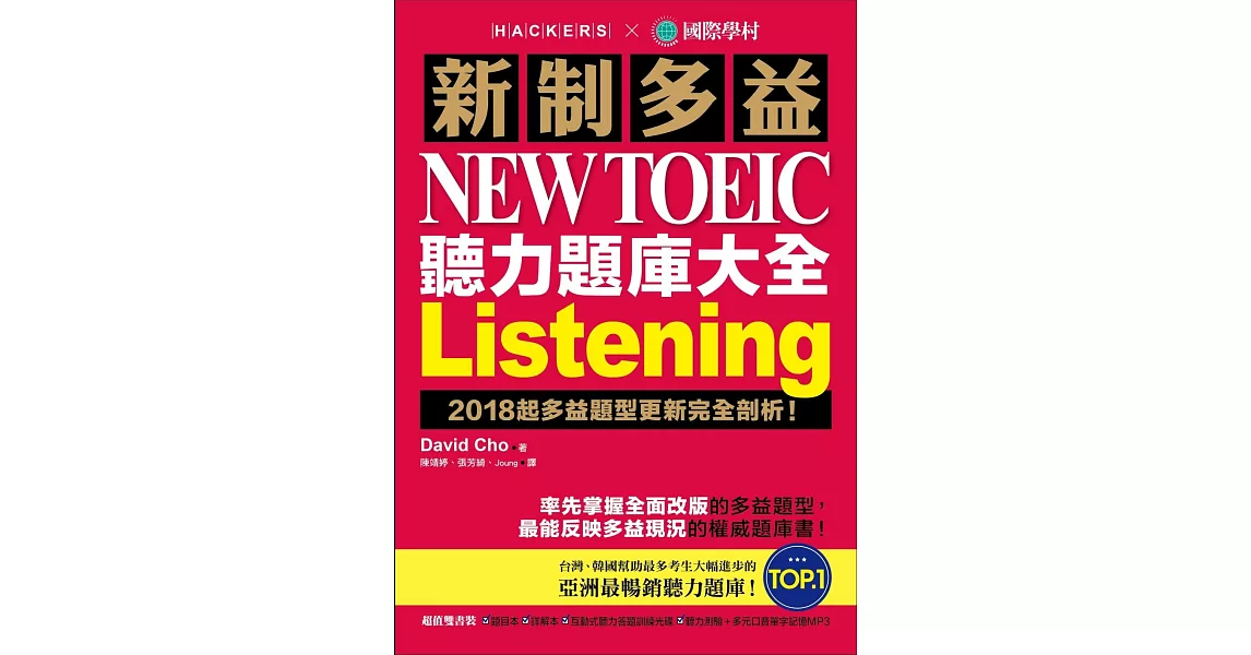 商品描述: 書名:新制多益 NEW TOEIC 聽力題庫大全:2018起多益題型更新完全剖析!(雙書裝+2 MP3+互動式聽力答題訓練光碟),原文名稱:해커스 신 토익 Listening,語言:繁體中文,ISBN:9789864540570,頁數:688,出版社:國際學村,作者:David Cho,譯者:陳靖婷,張芳綺,Joung,出版日期:2017/12/15,類別:語言學習