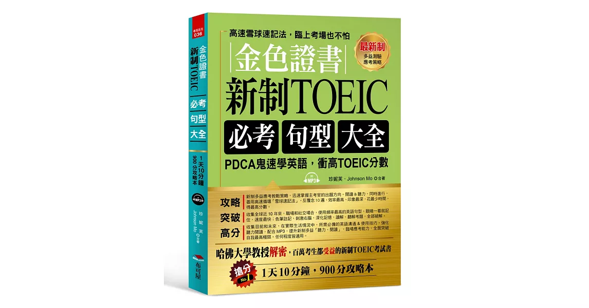 商品描述: 書名:金色證書:新制TOEIC必考句型大全 –PDCA鬼速學英語,衝高TOEIC分數(附MP3),語言:繁體中文,ISBN:9789869587242,頁數:320,出版社:布可屋,作者:珍妮芙,Johnson Mo,出版日期:2018/01/10,類別:語言學習