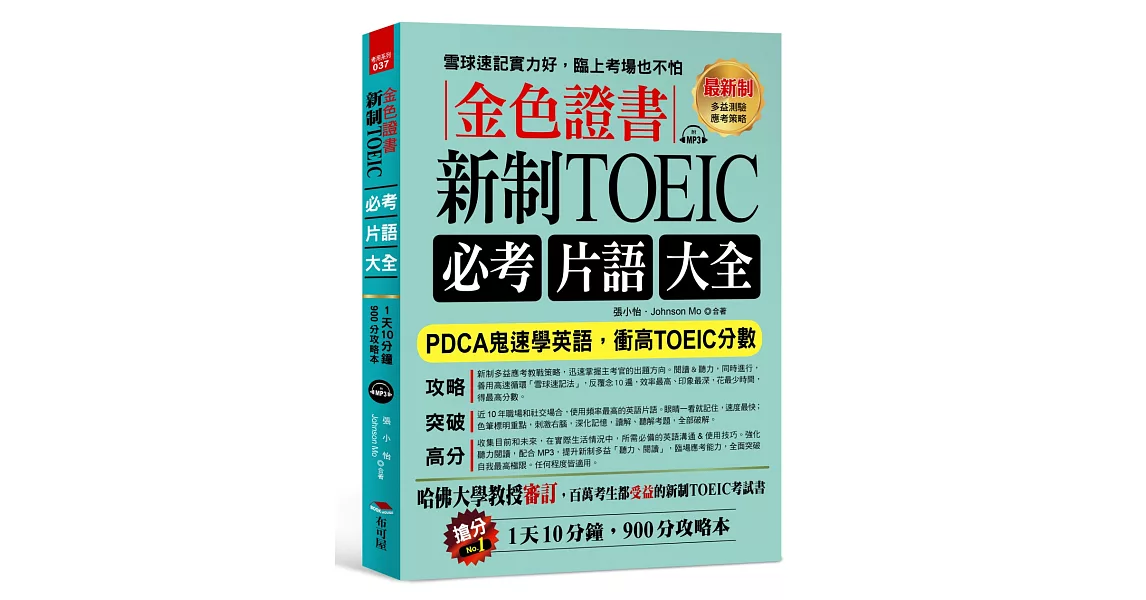 商品描述: 書名:金色證書:新制 TOEIC必考片語大全 –PDCA鬼速學英語,衝高TOEIC分數(附MP3),語言:繁體中文,ISBN:9789869587235,頁數:288,出版社:布可屋,作者:張小怡,Johnson Mo,出版日期:2018/01/31,類別:語言學習
