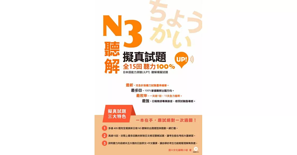 博客來-N3聽解擬真試題全15回聽力100%UP!訂購網址: https://www.books.com.tw/exep/assp.php/87926/products/0010769488?utm_source=87926&utm_medium=ap-books&utm_content=recommend&utm_campaign=ap-201906