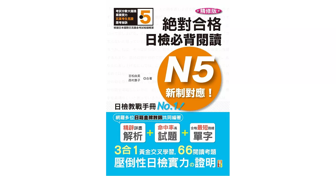 商品說明: 精修版 新制對應 絕對合格!日檢必背閱讀N5—(25K)