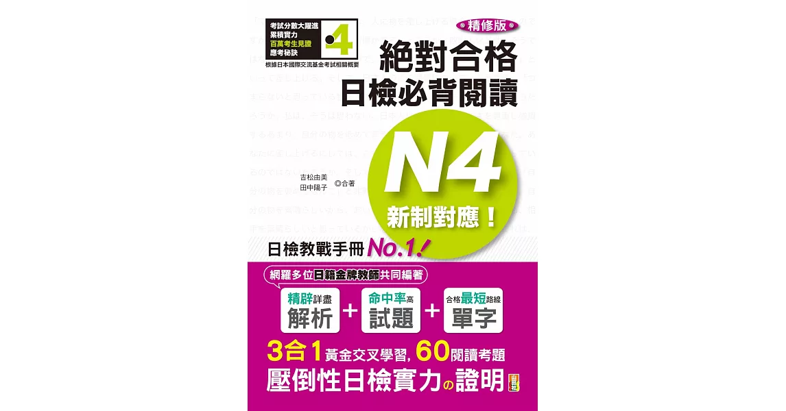 博客來-精修版 新制對應 絕對合格!日檢必背閱讀N4(25K)訂購網址: https://www.books.com.tw/exep/assp.php/87926/products/0010763063?utm_source=87926&utm_medium=ap-books&utm_content=recommend&utm_campaign=ap-201906