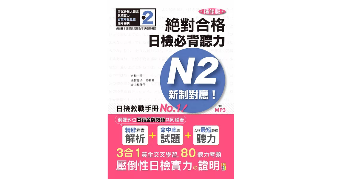 博客來-精修版 新制對應 絕對合格!日檢必背聽力N2(25K+MP3)訂購網址: https://www.books.com.tw/exep/assp.php/87926/products/0010759943?utm_source=87926&utm_medium=ap-books&utm_content=recommend&utm_campaign=ap-201906