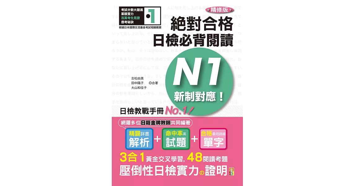 博客來-精修版 新制對應 絕對合格!日檢必背閱讀N1(25K)訂購網址: https://www.books.com.tw/exep/assp.php/87926/products/0010772005?utm_source=87926&utm_medium=ap-books&utm_content=recommend&utm_campaign=ap-201906