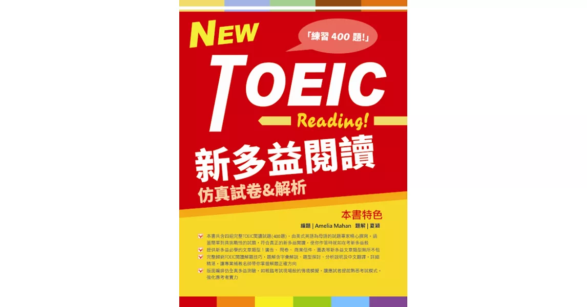 ■本書共含四組完整TOEIC閱讀試題(400題),由美式英語為母語的試題專家精心撰寫,涵蓋簡單到具挑戰性的試題,符合真正的新多益閱讀,使你作答時就如在考新多益般!