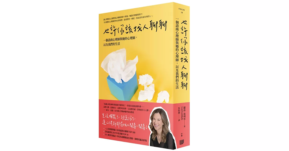 ►「原來心理醫師跟我們一樣!——至少《也許你該找人聊聊》是這麼說的。心理治療師蘿蕊・葛利布的這本書真誠、溫暖、有趣,讓人不知不覺沉浸其中(而裡頭沒有撲克臉的治療師)。她不只坦率寫出病人的掙扎,也寫出自己的掙扎。描寫心理治療師的書雖然不少,但這是我讀過最能產生共鳴的一本。」——蘇珊娜・卡哈蘭(Susannah Cahalan),著有《紐約時報》暢銷書《我發瘋的那段日子》(Brain on Fire: My Month of Madness)