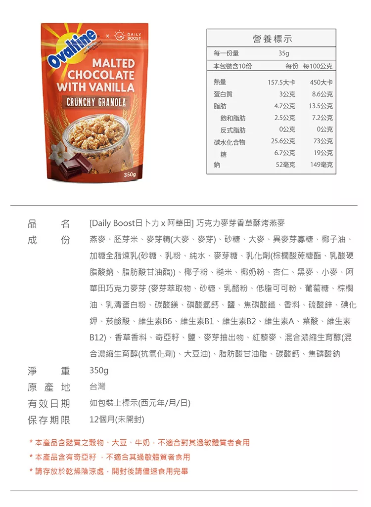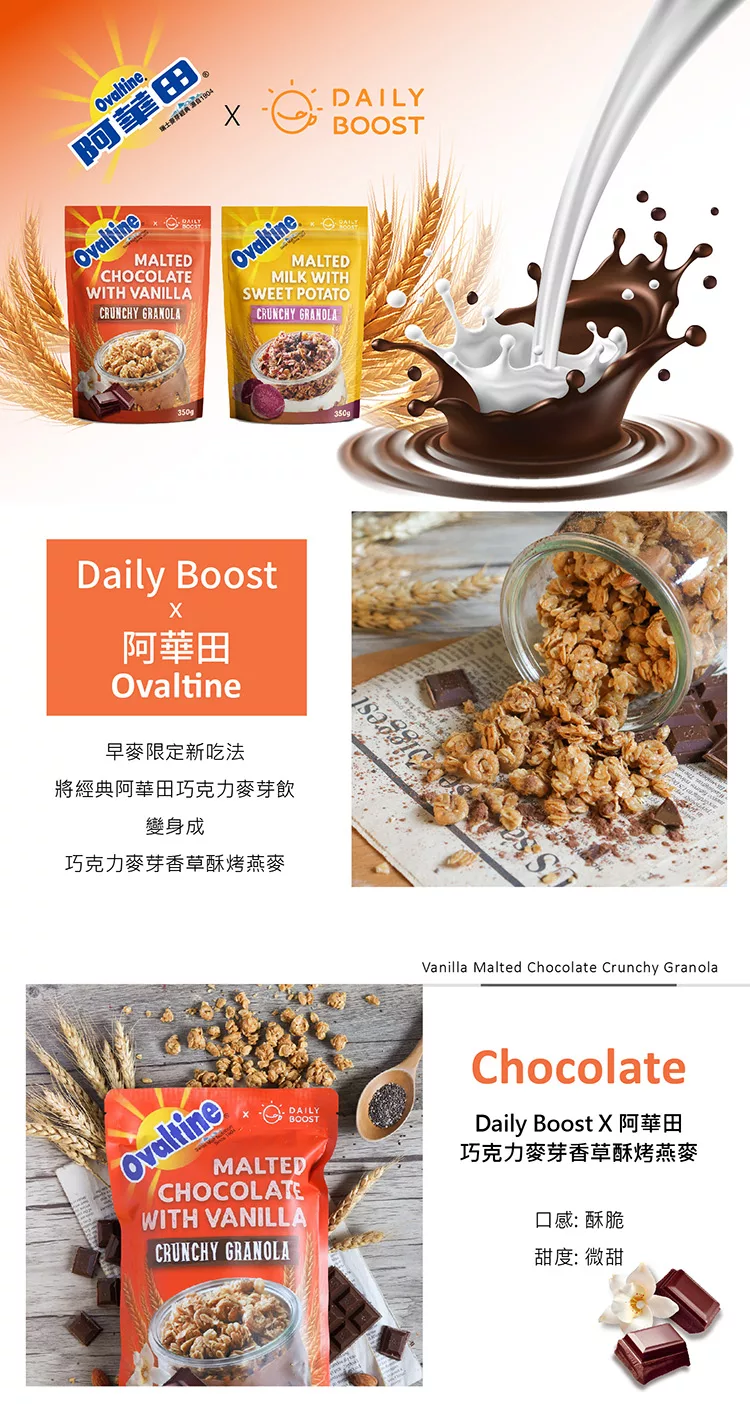 商品描述: 【Daily Boost日卜力】X【阿華田】巧克力麥芽香草酥烤燕麥(350g/袋)