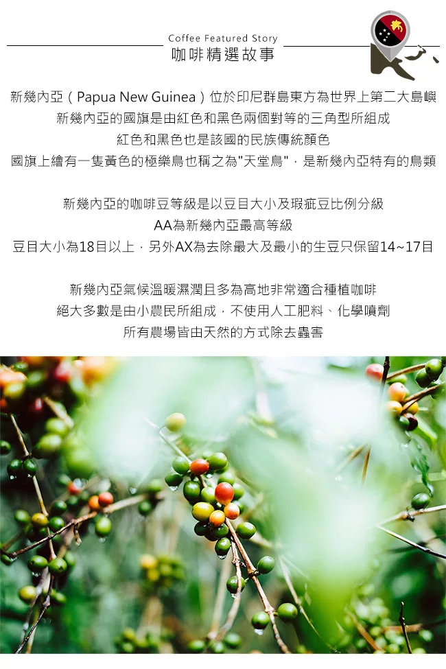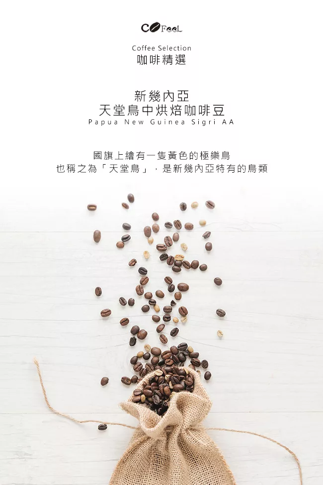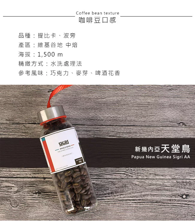 商品描述: CoFeel 凱飛鮮烘豆新幾內亞天堂鳥中烘焙咖啡豆玻璃精裝瓶