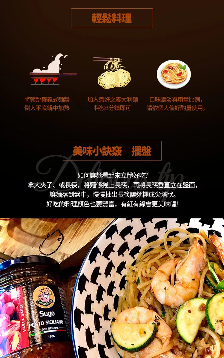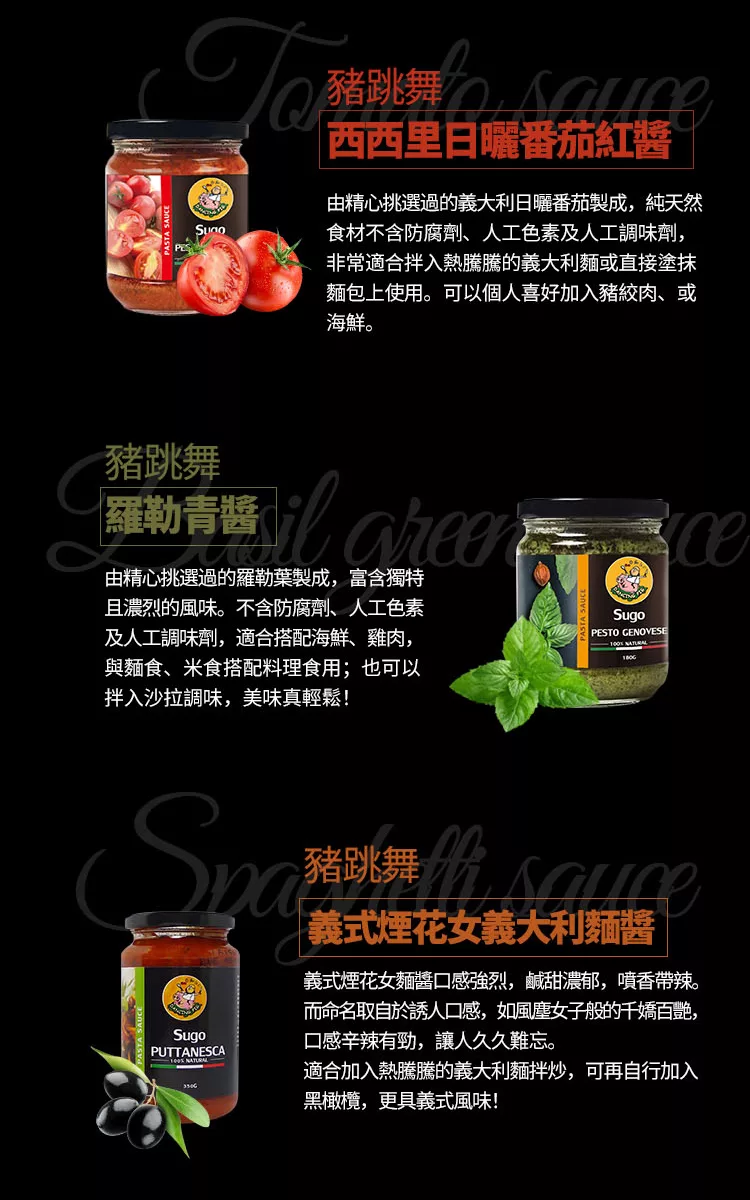 商品描述: 【豬跳舞】西西里日曬番茄紅醬 義大利醬麵(180g)