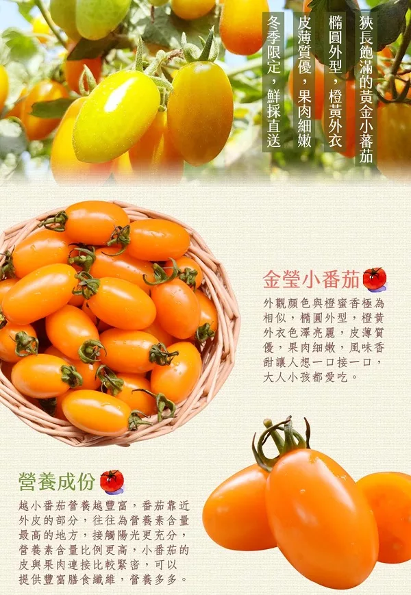 商品描述: 此商品為季節商品,出貨區間:12/15-12/21出貨※如有指定到貨日需求,請標示於收件地址後方,若不指定將以接單順序陸續出貨或公司出貨排程為主。 狹長飽滿的黃金小蕃茄橢圓外型,橙黃外衣皮薄質優,果肉細嫩冬季限定,鮮採直送產品內容物與規格說明/保固資訊:商品規格品名:《沁甜果園SSN》高雄金瑩番茄(5斤x2盒)重量:5斤x2盒品種:金瑩番茄產地:高雄配送物流:常溫配送保存方式:常溫可保存3~4天……