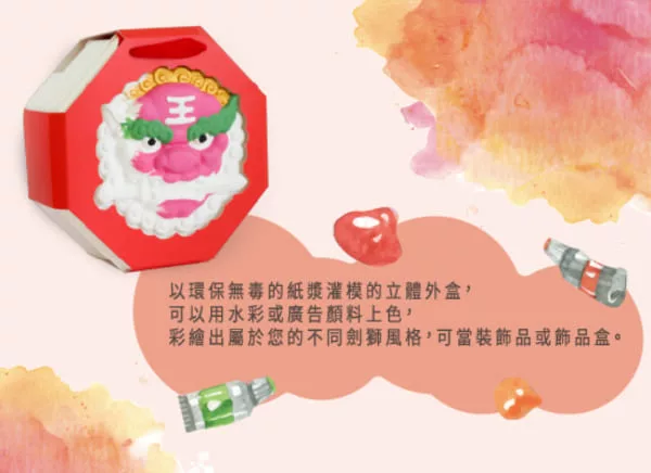 商品描述: 嚴選台南鳳梨與冬瓜調製出黃金比例內餡濃郁的鳳梨香氣與冬瓜清爽口感劍獅餅禮盒送禮自用兩相宜*劍獅圖為白色,外盒能自行DIY上色 商品介紹獅咬劍。什麼都不欠(台)著名的【安平劍獅】有著許多來自民間不同的考據,而【避邪祈福】則是民間每戶人家對未來的祈求。劍獅餅是由被封為「台灣國寶」的木雕大師陳啟村親自手工雕刻獨一無二的劍獅餅木模。裡面的餅是古早味鳳梨酥,嚴選台南在地鳳梨與冬瓜調製出黃金比例做為內餡,搭配……